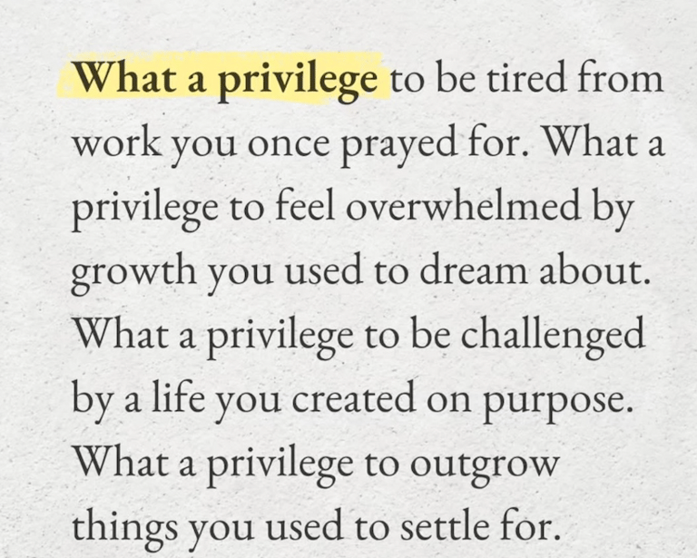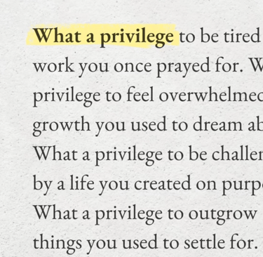 Privilege, the word conjures up different things for different people. It can be a loaded, triggering word these days, and rightly so. We often view people with perceived privilege as the villain, as the lucky ones, individuals who somehow possess something we see as unattainable. Money, respect, power, class, equality. Many of the issues we struggle with as a global society have devastating repercussions, and privilege certainly is included in that list. That is why the above statement caught my attention. It made me really think about what I do and do not have and why. Why is it important, why is it not....when you really stop and think about it, you may be surprised with your answers. Once you focus on the privileges you do have, and we all have them, no matter what our circumstances, it really does change the narrative. Appreciation for having the opportunity to...fill in the blank...can really make our perception of privilege change. This in turn, can help us soften attitudes towards ourselves and others. Which in this day and age, can be so healing for everyone.